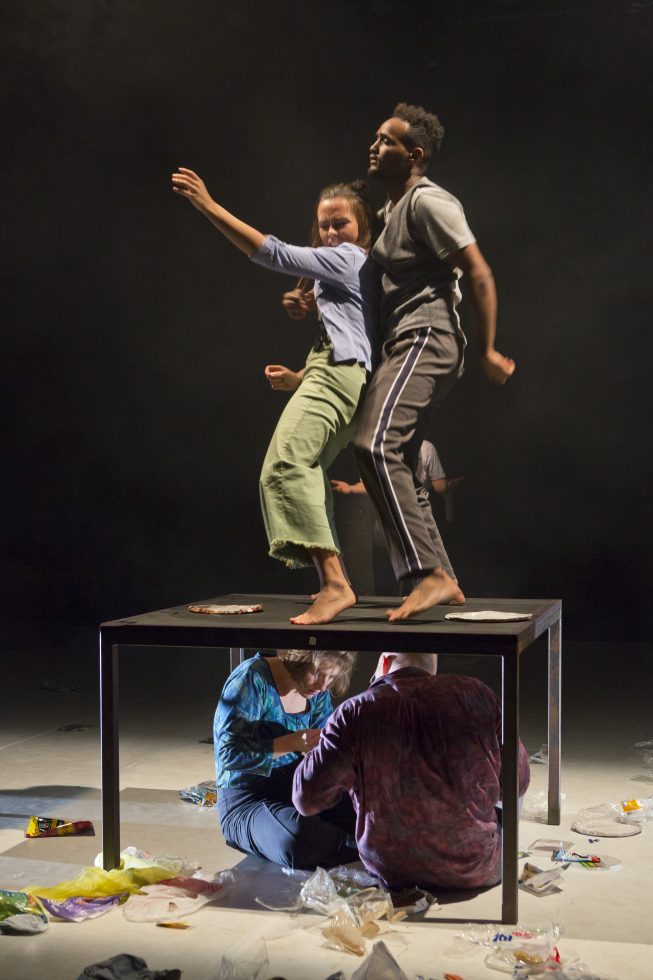 Ein Ensemble bittet zu Tisch. Bitte sehr! Ran an die Buletten oder lieber an die Veggiekiste. Völlerei versus Hunger – egal, Lebensmittel in die Tonne gekloppt, wird ja leicht gemacht. Das Stück (in der Regie von Judith Suermann und Angelika Schlaghecken) greift die aktuellen Themen wie Nahrung, globale politische Zusammenhänge und Nachhaltigkeit auf und stellt Fragen, zwischen hilflos und ungemütlich.